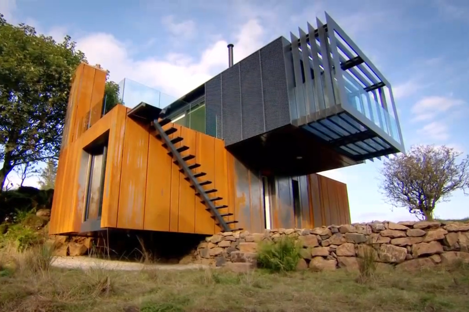 Dom został zbudowany z czterech 45 stopowych kontenerów morskich, które zostały ustawione na działce architekta w taki sposób aby utworzyły kształt krzyża. Na dwóch połączonych kontenerach na dole postawiono obrócone o 90 stopni kolejne dwa kontenery tworzące piętro. Całość została obudowana stalowymi panelami w kolorze ciemnego grafitu na górze oraz stalą typu corten na dole. Dzięki materiałom, które doskonale nawiązują charakterem do otaczającego krajobrazu, budynek doskonale wkomponował się w otoczenie.